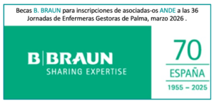 ANDE y B.BRAUN han firmado un acuerdo de ayuda para la formación, por el que B.BRAUN realiza una aportación destinada a financiar el coste económico de 15 becas para inscripciones de las 36 Jornadas Nacionales de Enfermeras Gestoras que se celebrará entre los días 11 a 13 de Marzo de 2026 en Palma de Mallorca.