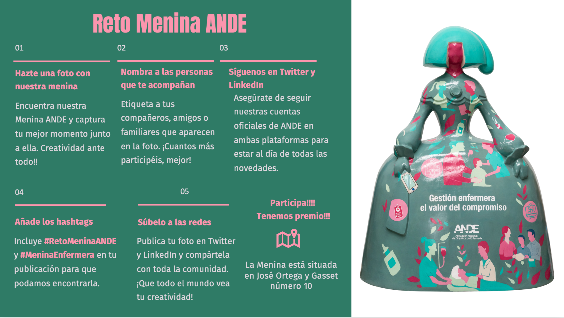 ANDE, con la finalidad de hacer mas presente en la sociedad la profesión enfermera en general y mas concretamente la responsabilidad y valor añadido de enfermeras y enfermeros gestores, lleva a cabo esta iniciativa a la que invita a que se unan cuantas enfermeras, profesionales del sector sanitario, educativo o sociosanitario, pacientes, familias y/o amigos. La menina está situada en José Ortega y Gasset número 10. Mas información sobre esta iniciativa.